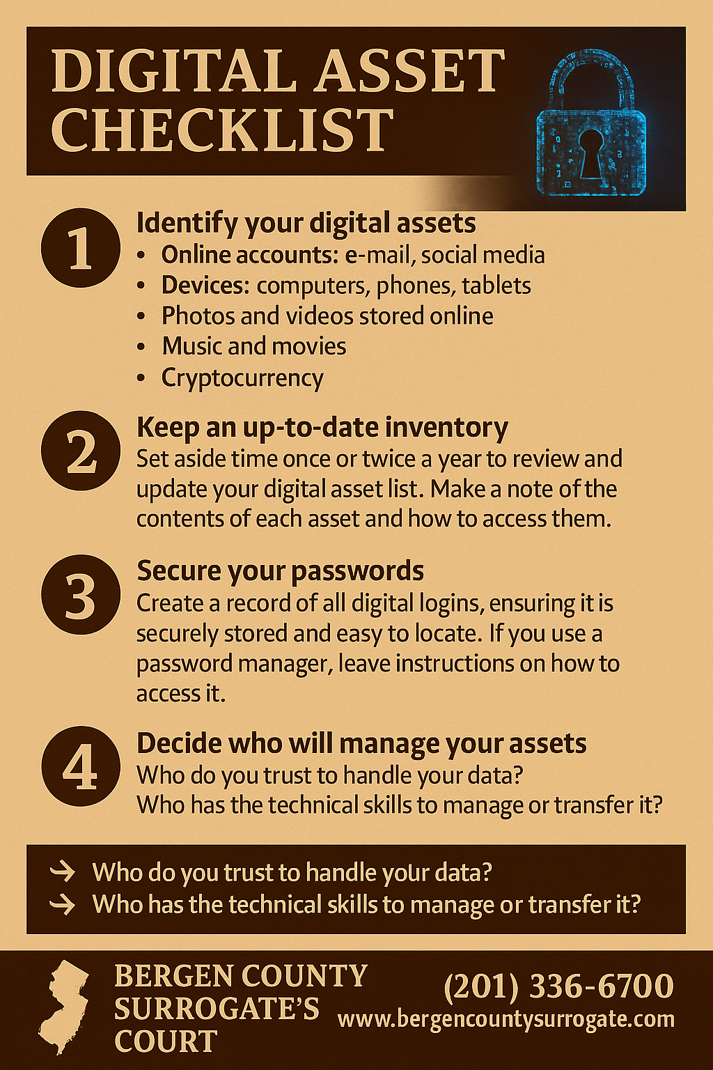 If you have questions about how digital assets may affect a probate matter in Bergen County, or if you are unsure where to begin, please do not hesitate to call the Bergen County Surrogate’s Court at (201) 336-6700. My staff and I are grateful for the opportunity to serve our friends, neighbors and families here in Bergen County, and we are always glad to help point you in the right direction.